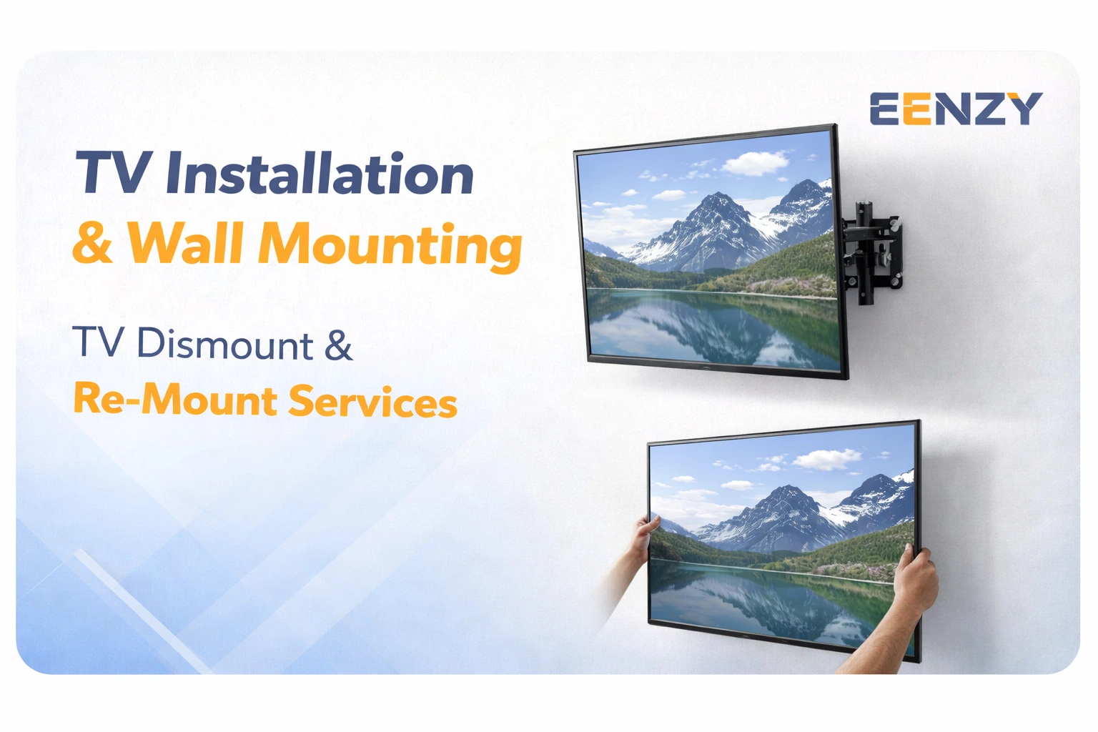 eenzy’s Tv mounting service includes different services, such as Tv installation, Tv wall mounting, concealing the wires and cords, setting up home theater AV, and installing soundbars. Tv mounting is the most popular service of eenzy that is offered by experienced handymen.
